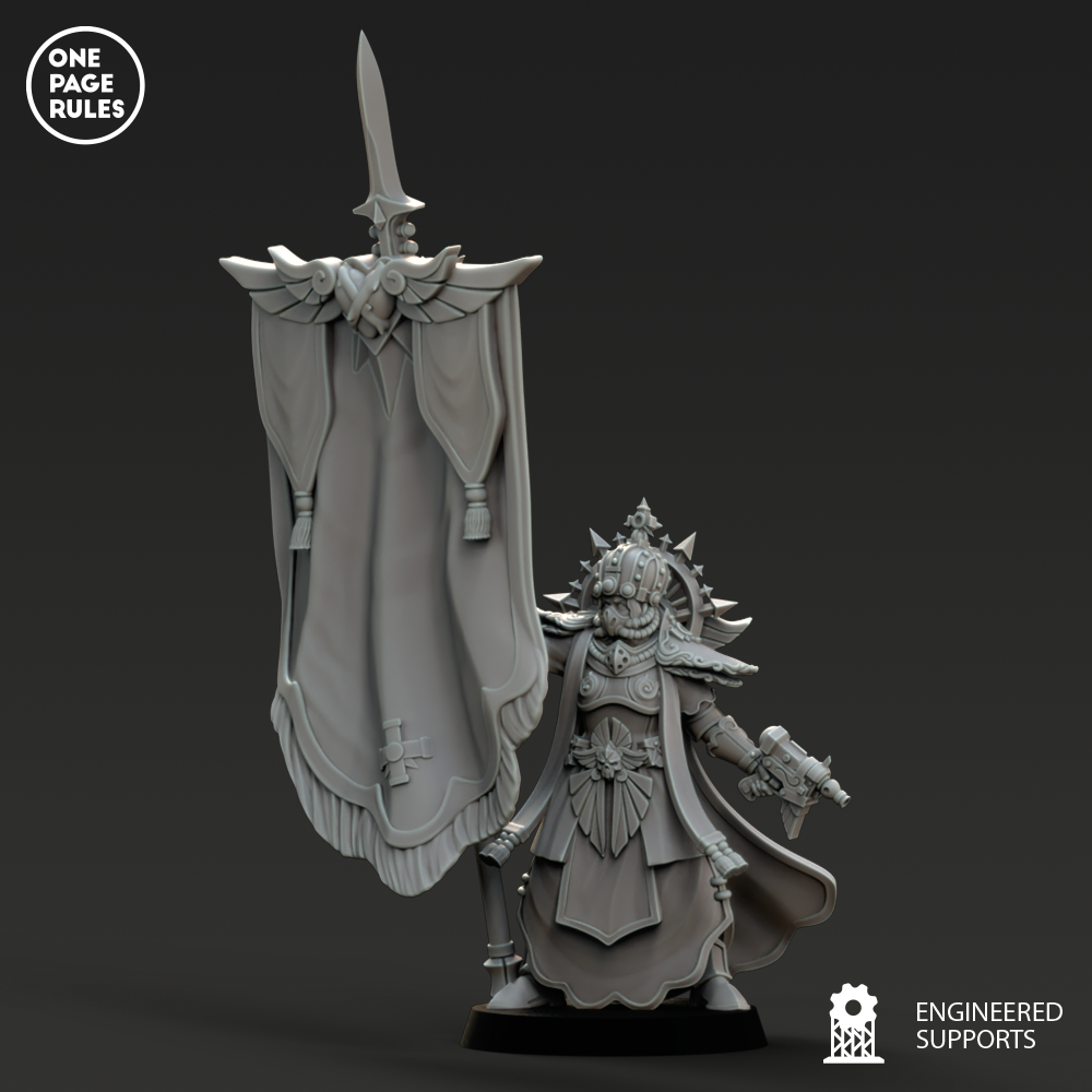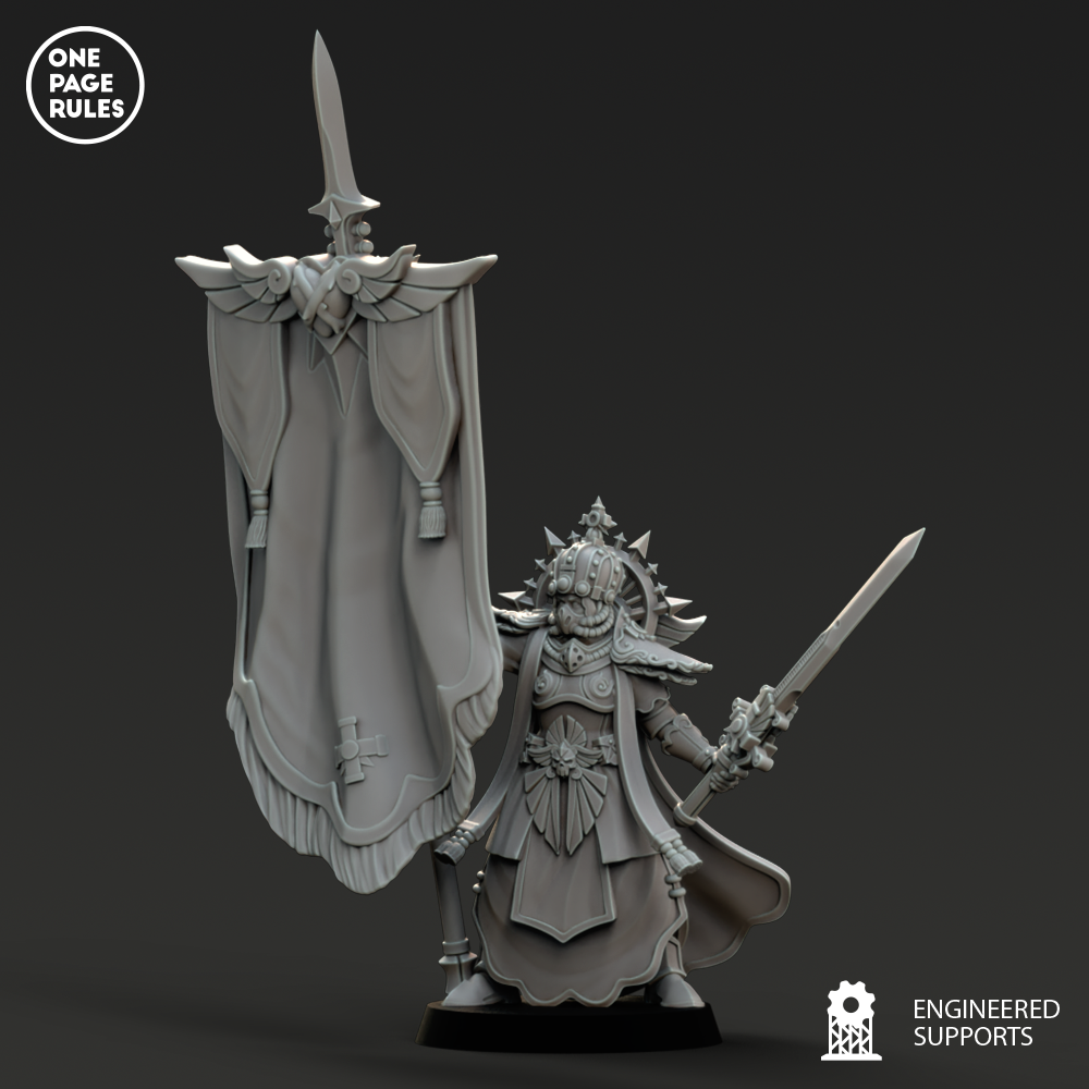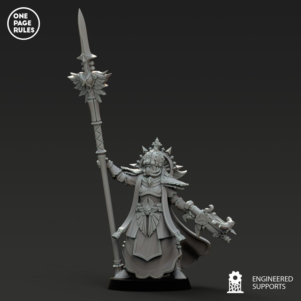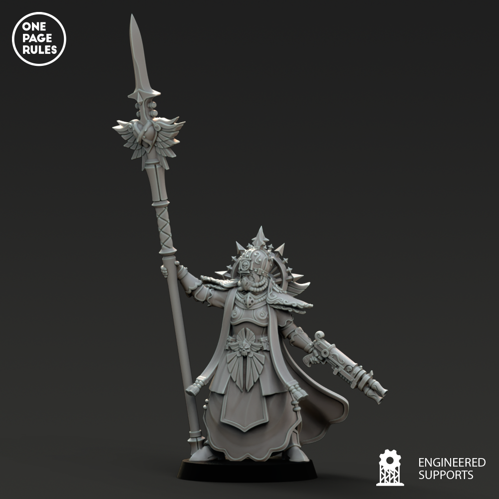 Revêtue d’une armure reliquaire gravée de prières, ornée de symboles de martyres passés et de saints vivants, la Canoness avance au milieu du tumulte comme une statue animée de volonté impériale. Son regard perce la peur, sa voix étouffe le doute, et son arme — souvent un épieu de commandement, un sabre sanctifié ou un sceptre-flamme tranche la corruption comme l’air.