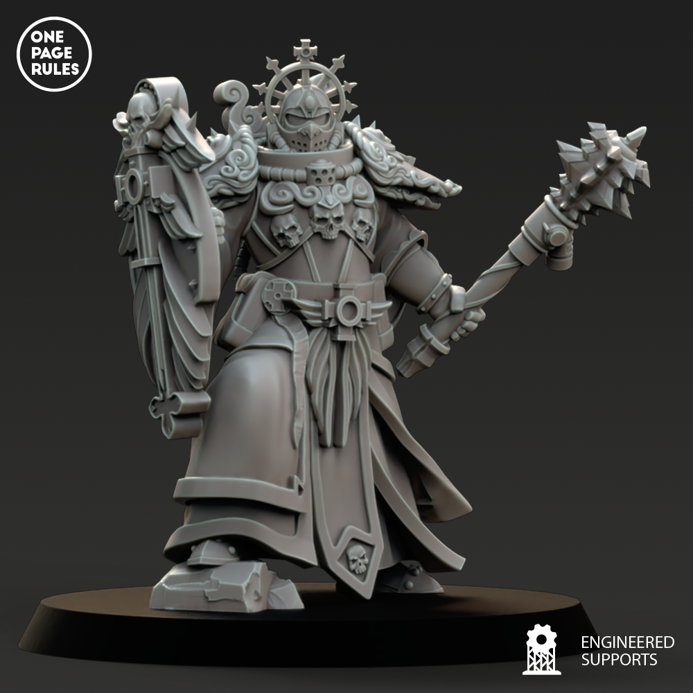 Son corps est bardé de métal sacré, ses bras porteurs d’armes démesurées : lames tronçonnantes, gantelets d’impact, masses d’auto-pénitence ou canons à souffle court, toujours conçus pour une chose : écraser l’ennemi, purifier par la destruction, avancer sans peur.