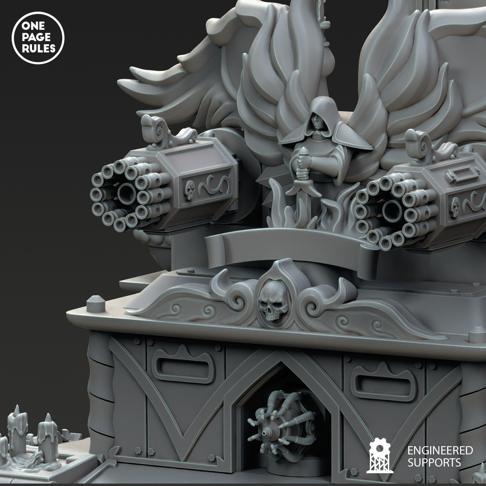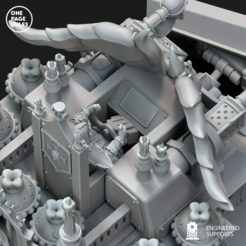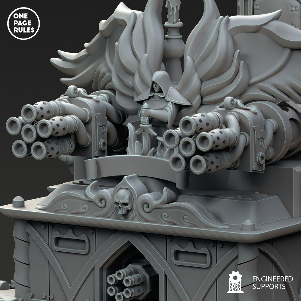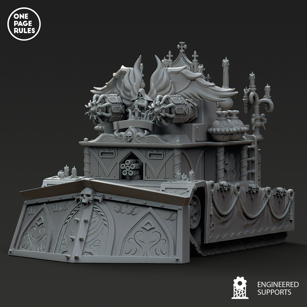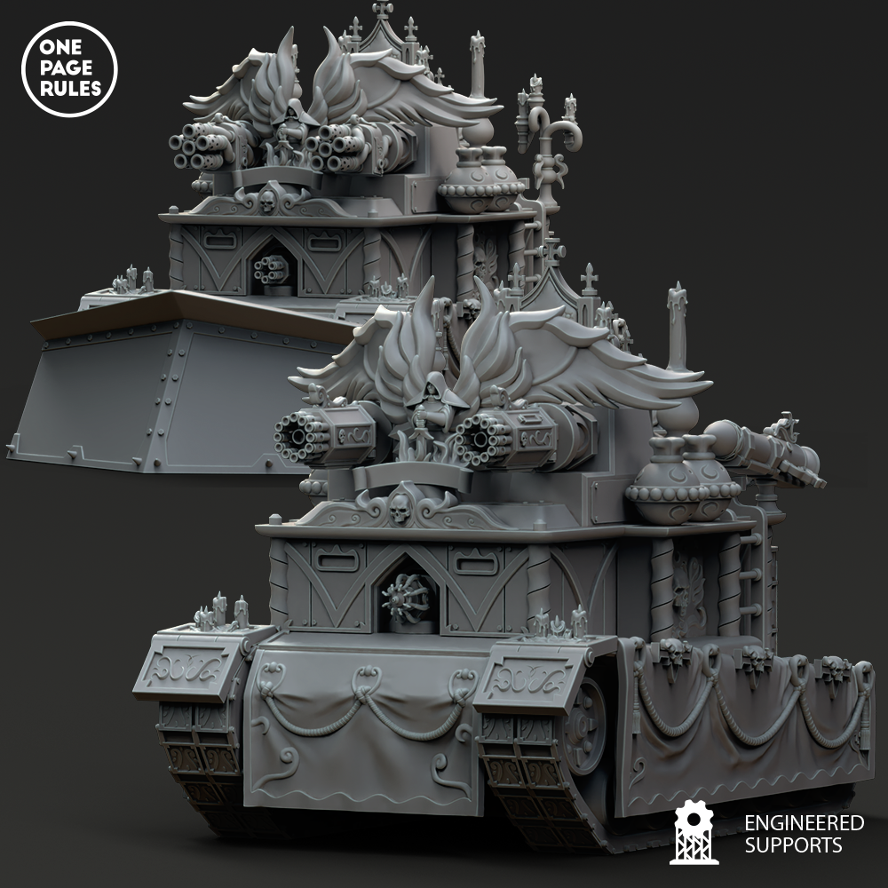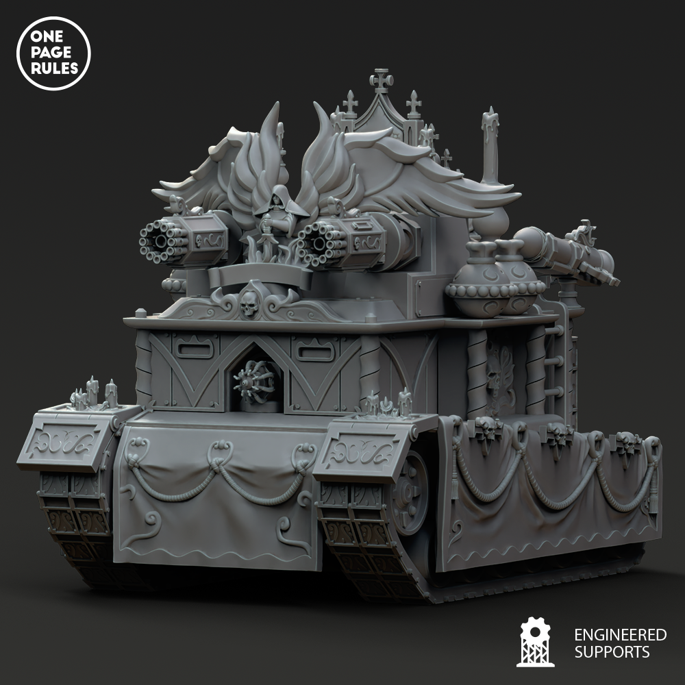 Chaque recoin de son blindage est gravé de litanies de pénitence, ses conduits de vapeur diffusent des encens corrosifs, et ses flancs sont hérissés de lance-flammes sanctifiés, de projecteurs de naphthe bénite, et parfois même de bouches à encens incendiaires. Ce n’est pas un simple char… c’est un sanctuaire roulant en croisade.