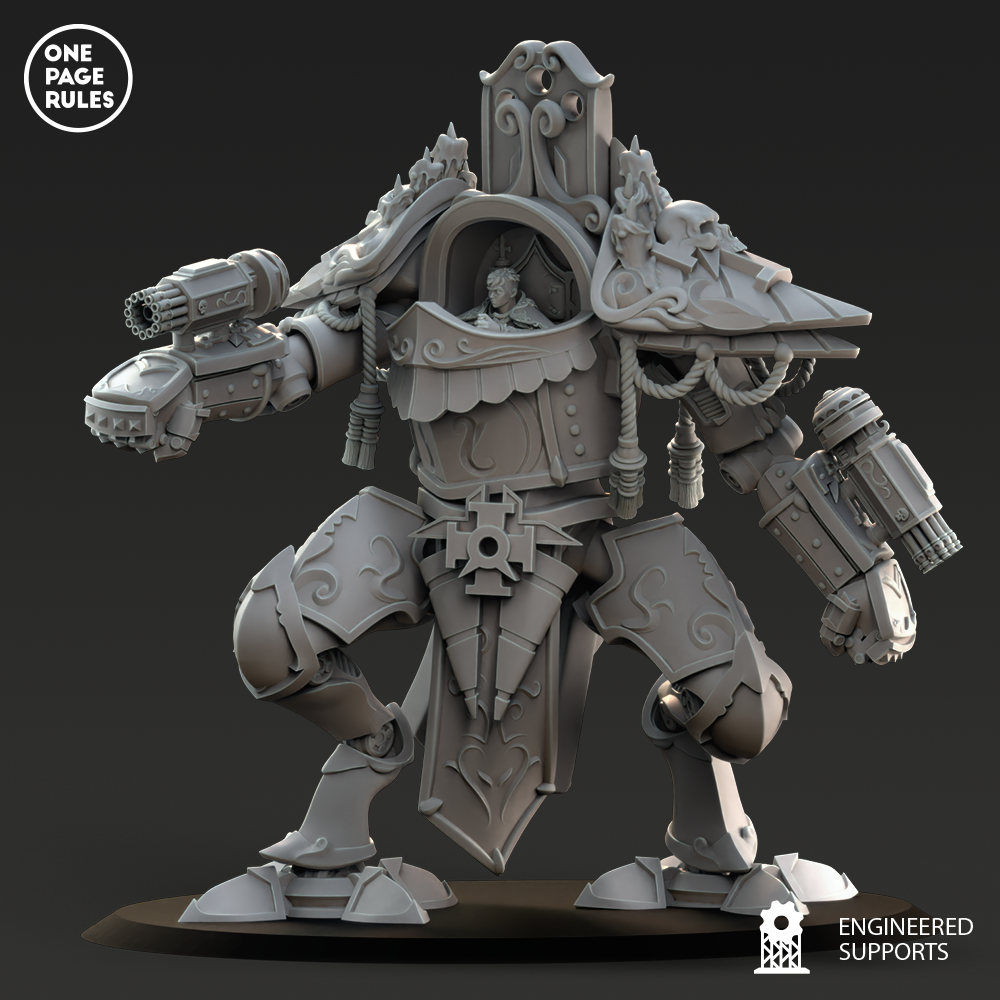 Son rôle n’est pas de mener la charge, mais de suivre la ligne, de renforcer la formation, et de stabiliser le front. Ses bras mécaniques portent souvent une combinaison de lance-flammes purificateurs, de bolters lourds, ou de projecteurs de bouclier sacré, tandis que son châssis blindé est décoré de bannières flottantes et de chapelets de reliques.