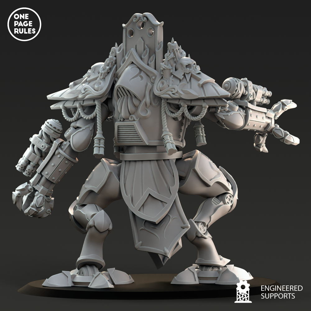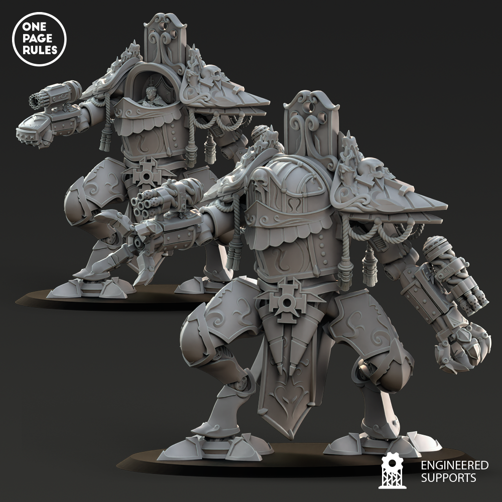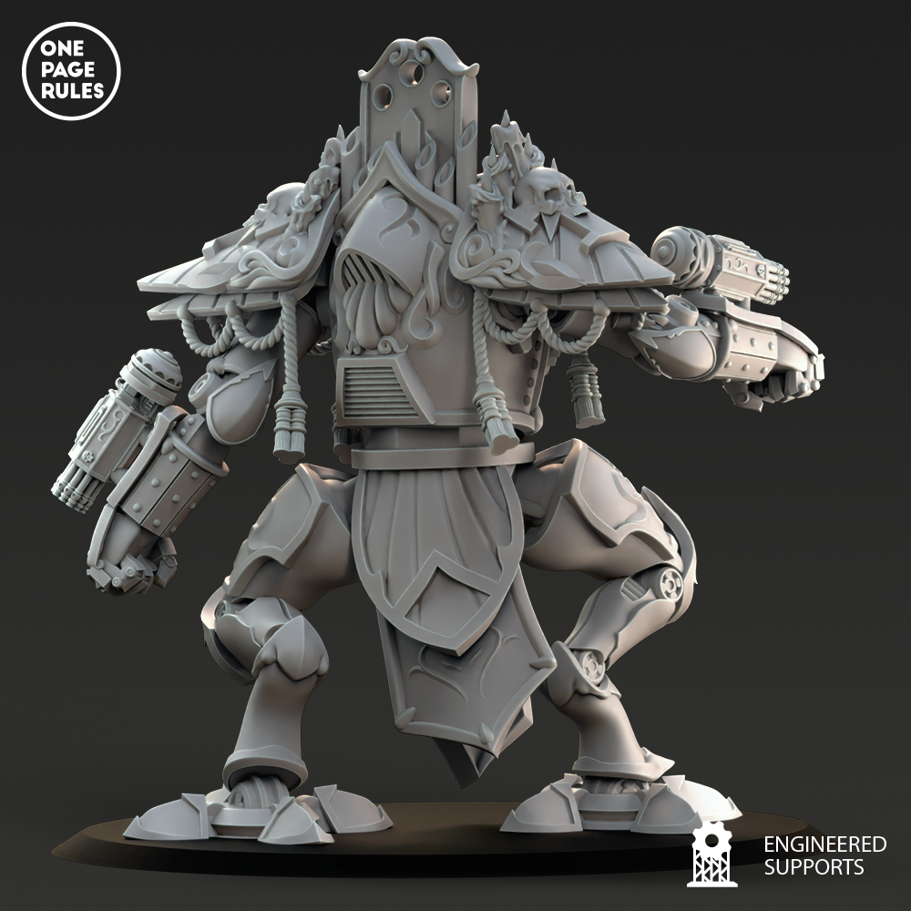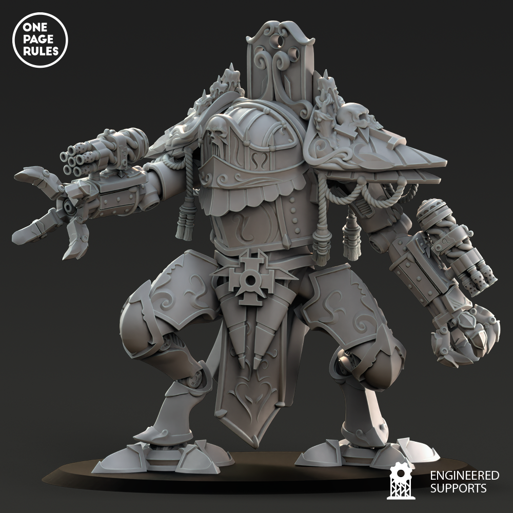 Le Support Walker est une machine bipède bénie, plus agile et plus sobrement armée que ses cousins d’assaut, mais essentielle dans les rangs des Blessed Sisters pour offrir protection, bénédiction et appui tactique aux troupes sur le terrain. Là où le feu rugit et la foi vacille, le Support Walker avance, encensoirs fumants et projecteurs d’huile sainte activés, comme un autel de guerre monté sur jambes d’acier.