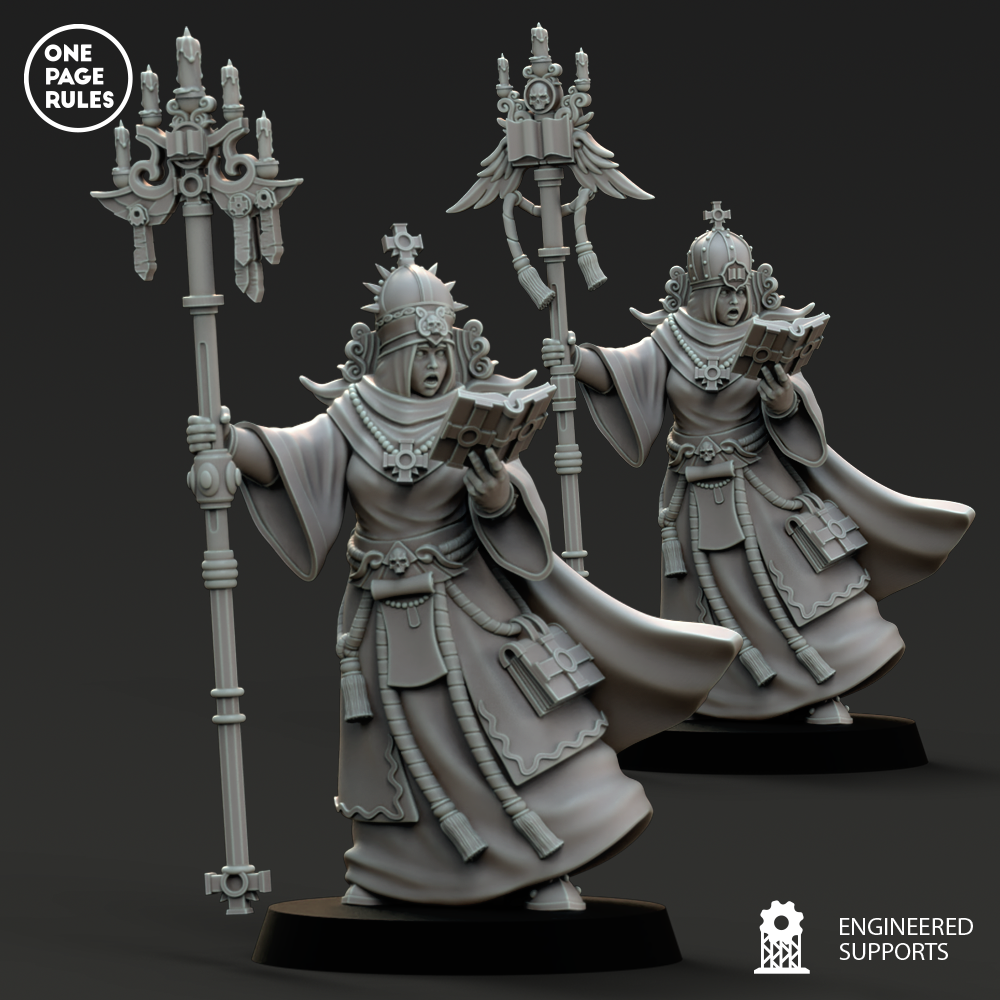 Rejetées par certains comme hérétiques, elles sont néanmoins tolérées au sein des rangs des fidèles en raison de leur efficacité sur le champ de bataille. Leurs bâtons de sorcellerie sacrée leur permettent de manipuler la réalité, bénissant les troupes alliées ou maudissant les adversaires d’un seul geste.