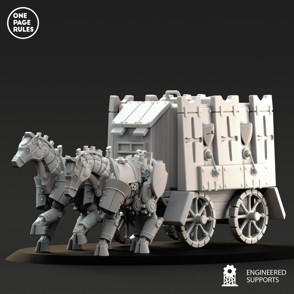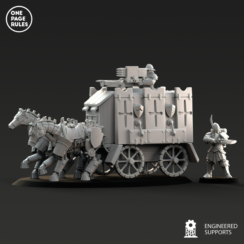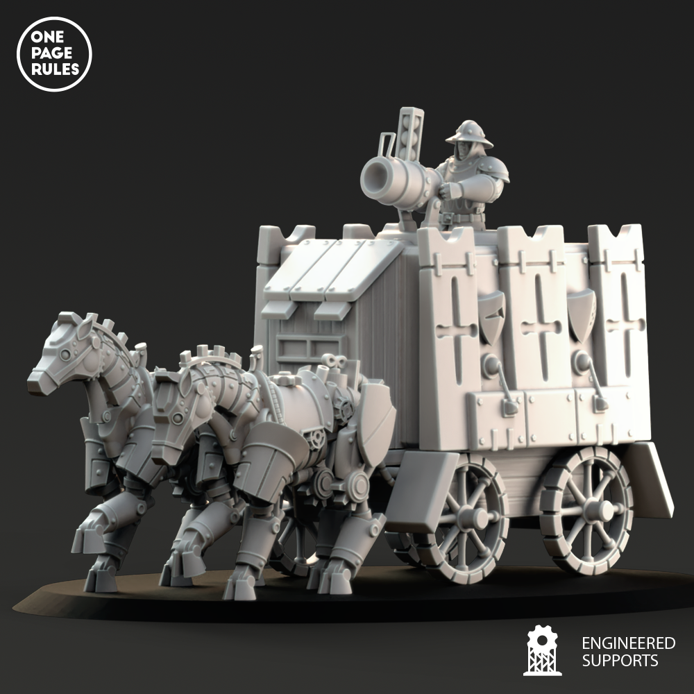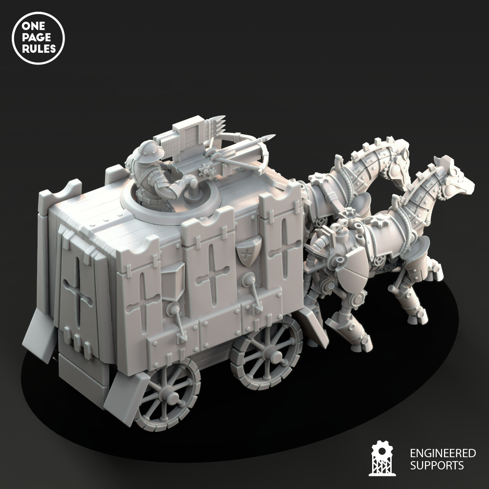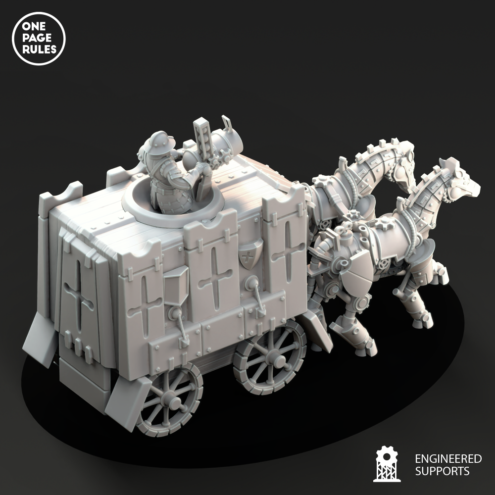 Le Support Wagon est le trait d’union blindé entre la technologie raffinée des Duchies of Vinci et leur besoin croissant de mobilité tactique. Construit à partir d’un châssis de char léger, renforcé par des plaques rivetées et actionné par un moteur à piston vapeur, il offre aux forces vinci un transport fiable, robuste, et souvent redoutablement décoré.