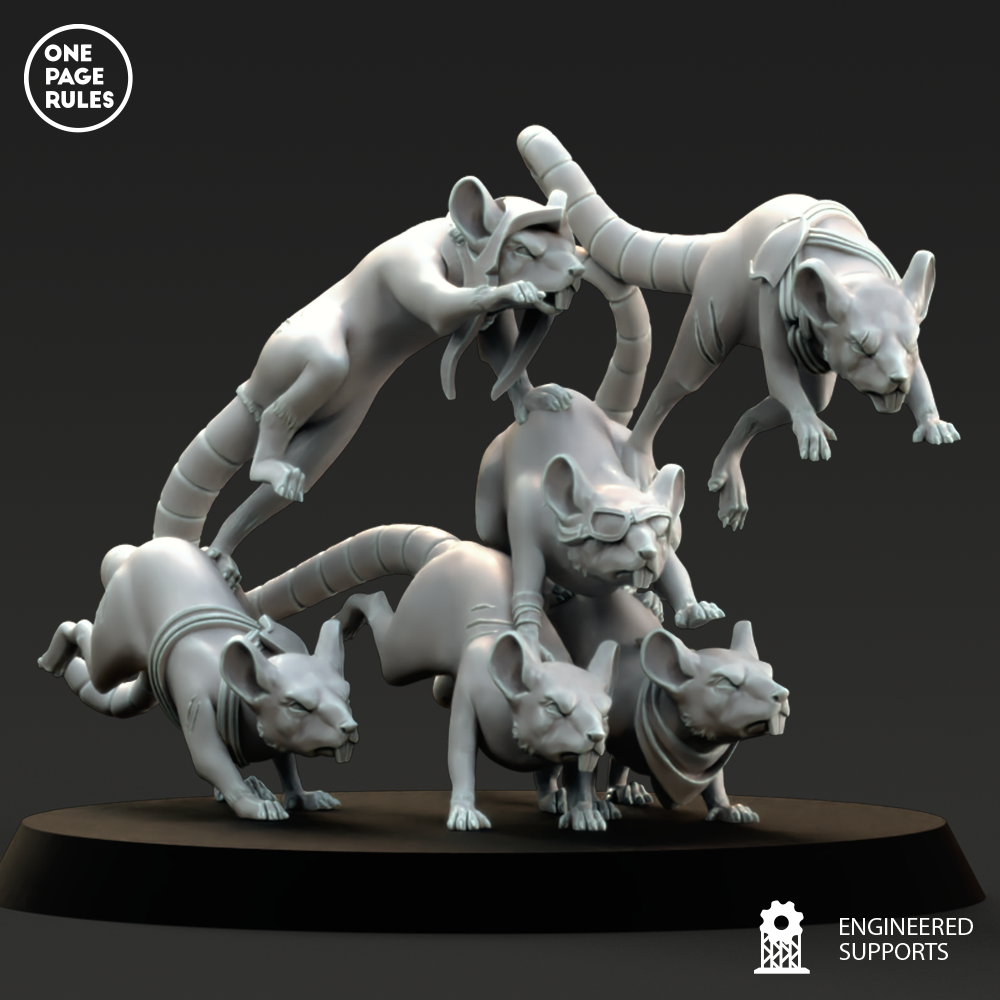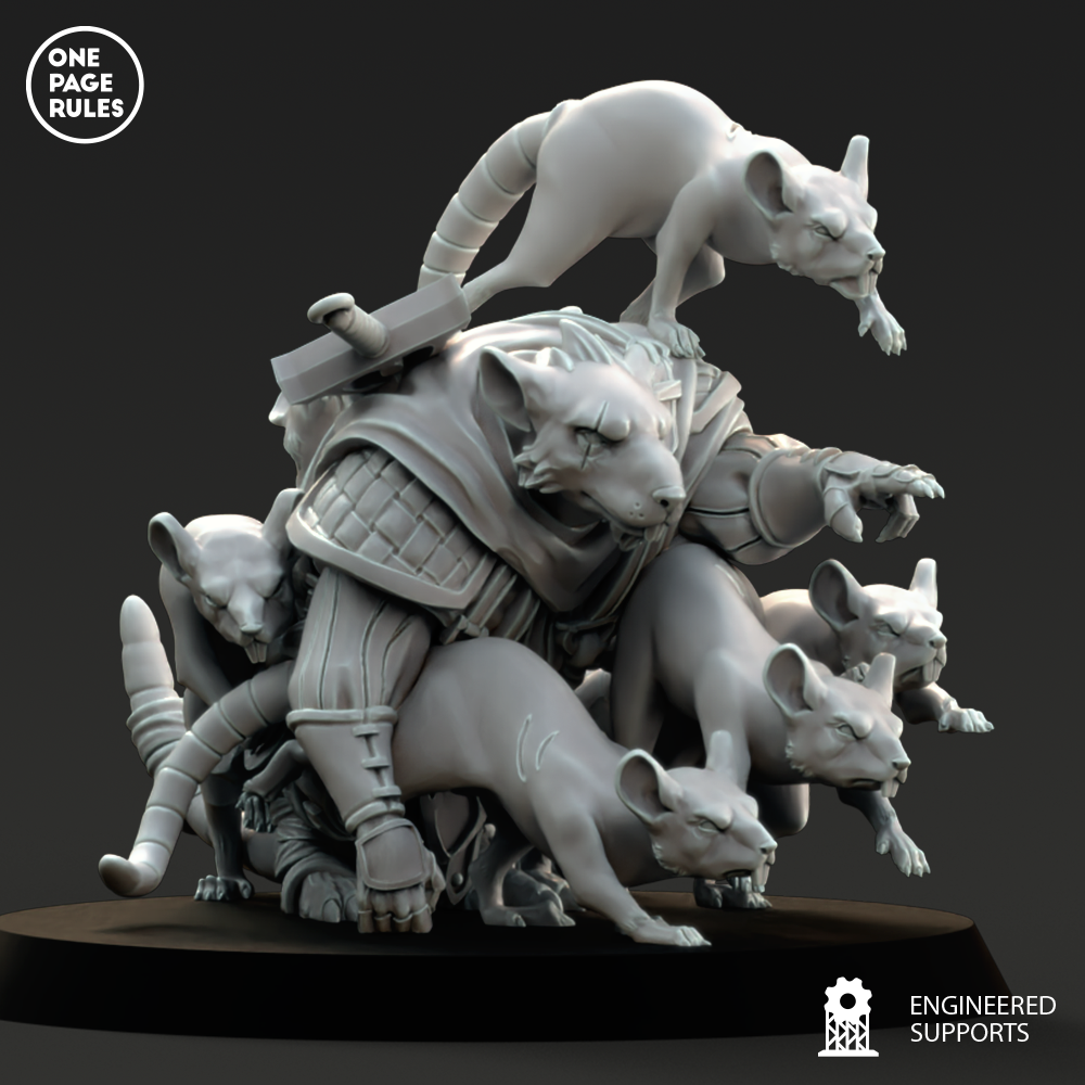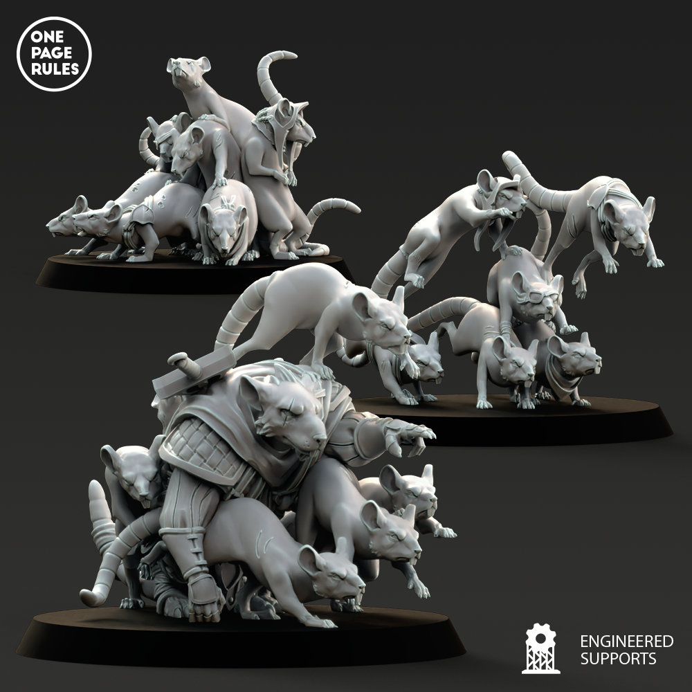 Les Giant Rat Swarms sont la base grouillante de toute armée ratmen, une masse vivante de dents affûtées, de griffes sales et de hurlements stridents. Ces nuées, formées de rats trop grands pour être naturels, sont dirigées par l’odeur du sang, les cris de leurs maîtres ou parfois simplement la faim qui les ronge.
