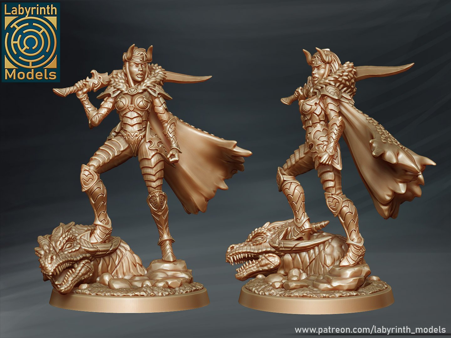 Forgée par le feu et le sang, la Tueuse de Dragons est une figure de légende, celle que l’on invoque quand les armées reculent et que les monstres règnent. Armée d’une lame massive, drapée d’une cape balayée par le vent, elle se tient victorieuse sur les restes de sa proie, incarnant la détermination absolue face à l’horreur draconique.
